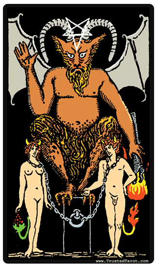 The Devil is in the business of entrapment. It signifies a situation from which there is no escape, or a road leading to one. Forewarning may let you avoid the trap, or it may not. What sort of trap, and how you might avoid it, depends on where the Devil appears in your spread, and what other cards surround it. This card does not foretell doom, only the need for prudence.