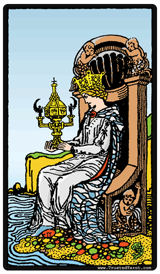 La sensibilidad y la naturaleza afectuosa están tradicionalmente asociadas con la Reina de Copas, quien es el equilibrio emocional para el Rey. A pesar de su abierta naturaleza, vas a ver que su influencia es bastante pasiva. Particularmente para los hombres, su presencia es un recordatorio para mantenerse en contacto con los aspectos emocionales de su carácter. Debes de tomar su presencia como una gentil mano que busca mostrarte el poder de tus propios aspectos interiores, cuyo poder puede estar oculto por su naturaleza calmada.